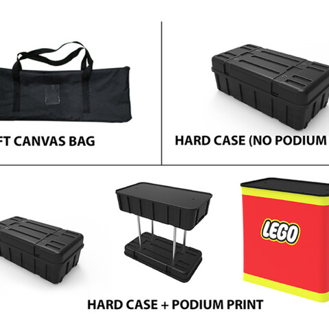 Featuring a blend of a flat tension fabric backwall display, a flat tension fabric header, a tension fabric television banner stand, a podium (with included carrying case), and a duo of LED light fixtures, this unique booth has the ability to engage any audience.