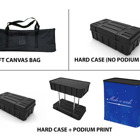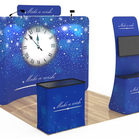 Featuring a curved and collapsible tension fabric backwall display, a curved tension fabric header, a television display table banner stand, a podium (with included carrying case), and a duo of LED light fixtures, this unique booth has the ability to engage any audience.