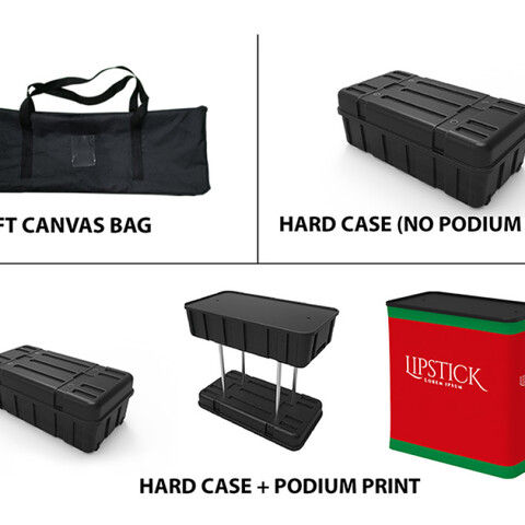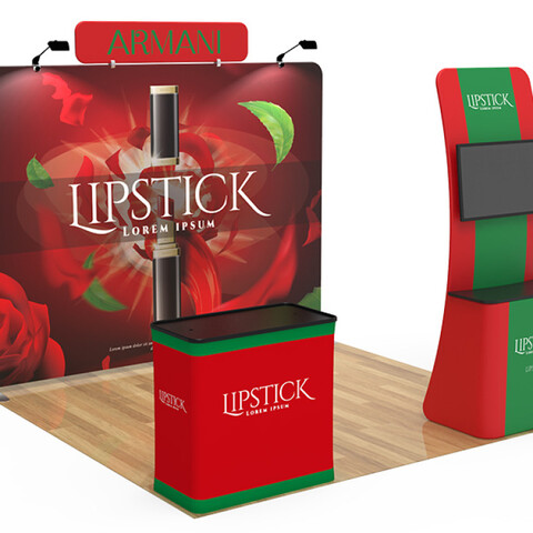 Featuring a blend of a flat tension fabric backwall display, a flat tension fabric header, a television display table banner stand, a podium (with included carrying case), and two LED light fixtures, this unique booth has the ability to engage any audience.