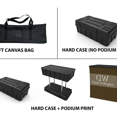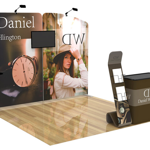 Featuring a blend of flat and angled backwall displays, a literature and brochure stand, a fabric shelf, a podium (with included carrying case), a television monitor bracket, and a duo of LED light fixtures, this unique booth has the ability to engage any audience.
