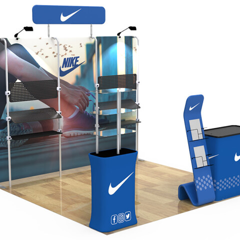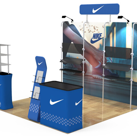 Featuring a fabrice trase show backwall display, a flat tension fabric header, four tube columns, two LED Lights and light clips, six hangers, a hard case podium, a display tower counter and a serpentine brochure and literature banner stand, this unique booth has the ability to engage any audience.