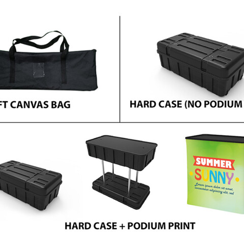 Featuring a blend of three flat tension fabric backwall displays, a flat tension fabric header, a podium (with included carrying case), a literature and brochure stand, two tube columns, three hangers, and a trio of LED light fixtures, this unique booth has the ability to engage any audience.