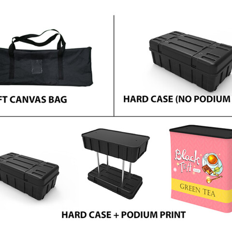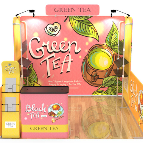 Featuring a blend of five flat tension fabric backwall displays, a flat tension fabric header, a brochure and literature banner stand, a television display table banner stand, a podium (with included carrying case), four tube column, six hangers, and four LED light fixtures, this unique booth has the ability to engage any audience.