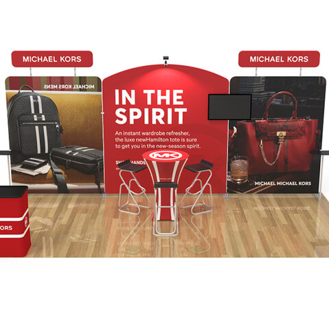 Featuring 2 custom flat tension fabric backwall displays, 2 custom flat tension fabric headers, 1 monitor brackets, 2 tension fabric shelving kits, 1 custom higboy bar height cocktail table, 1 hard case to poduim with custom printed graphic, 1 tension fabric iPad, tablet and literature banner stand, and 1 tade show display LED light and light clip, this booth has the ability to engage any audience.