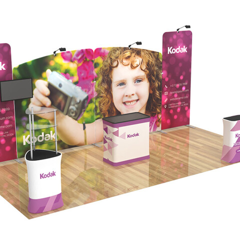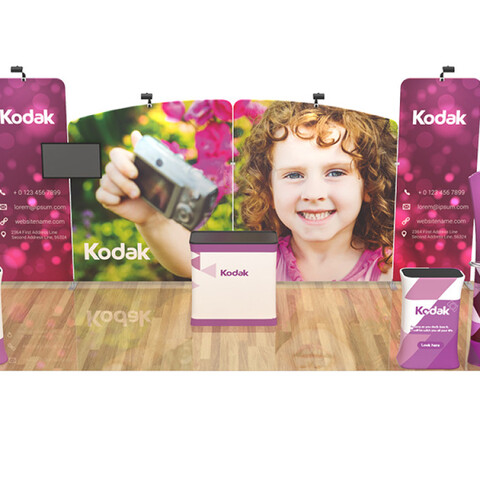 Featuring 1 rectangular display counter with full color print, 2 flat top tension frabric backwall displays, 2 angled top tension fabric backwall displays, 1 hard case to podium with custom printed graphic, 4 trade show display LED lights and clips, 1 monitor bracket, 2 banner stand LED lights with clip, 1 curved top tension fabric banner stand, 2 arm shelves for top tension fabric banner stand and 1 triangular display tower counter with custom graphic, this booth has the ability to engage any audience.