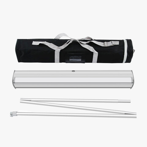 Standard retractable banner stands are lightweight and economical. Their compact aluminum hardware has two folding feet that rotate out for stability when the stand is on display, and rotate back in for storage in the complimentary carrying bag. The full color graphics come on UV printed fabric inserts with curl free edges and gray blockout backing. For those that want a legacy feel we still offer 13oz matte vinyl prints as well. Great for traveling, these stands take mere seconds to display and when the show is over the insert is retracted into the hardware for safe keeping.